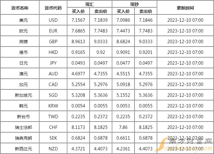 兴业银行外汇牌价表2023年12月10日 人民币对美元汇率是多少?随南方财富网三江君来看看。