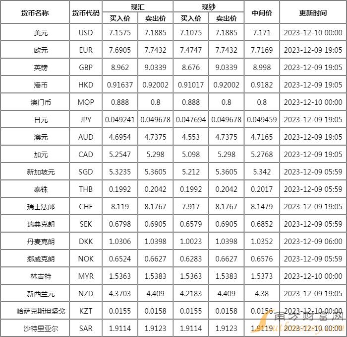 xm外汇:12月10日中信银行外汇牌价表查询 人民币对美元汇率是多少?